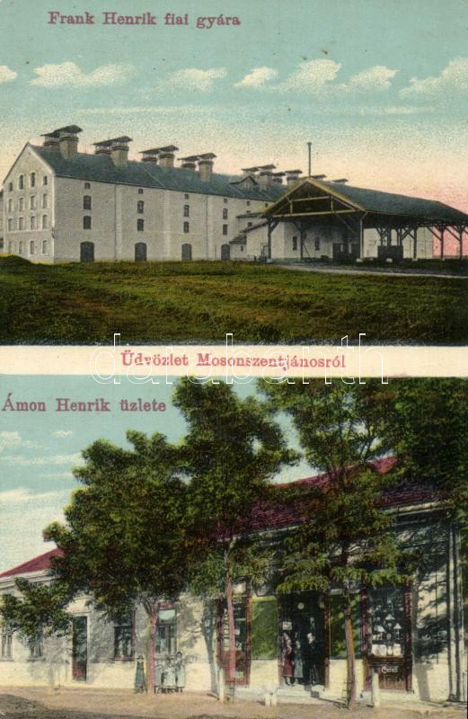 Mosonszentjános, Frank Henrik fiai gyára, Ámon Henrik üzlete (EK) https://www.darabanth.com/de/187-Fernauktion/187.0/Ansichtskarten/Ungarn~3000004/Mosonszentjanos-Frank-Henrik-fiai-gyara-Amon-Henrik-uzlete-EK~II692656