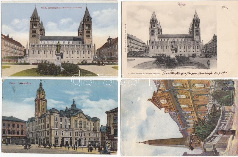 Beschreibung: Pécs 4 db városképes lap, Székesegyház és Városháza