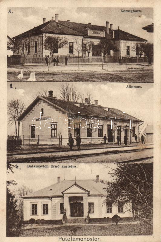 Beschreibung: Pusztamonostor vasútállomás, Balazsovich Ernő kastélya, községháza (ragasztónyom / gluemark) (kis szakadás / small tear)