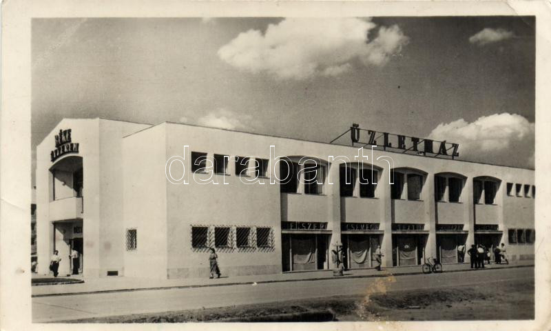 Beschreibung: Sztálinváros Fűszer, csemege, textil, ruházat, divatáru üzletház, Béke Étterem (EB)