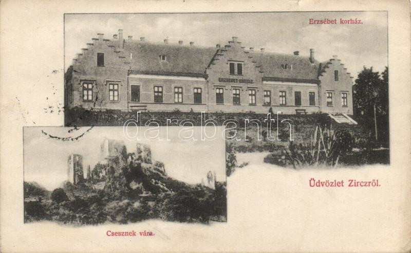 Zirc Erzsébet kórház, Csesznek vára (kis szakadás / small tear) https://www.darabanth.com/de/187-Fernauktion/187.0/Ansichtskarten/Ungarn~3000004/Zirc-Erzsebet-korhaz-Csesznek-vara-kis-szakadas-small-tear~II691044