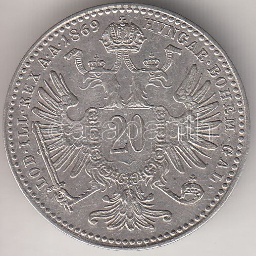 Austria 1869. 20 Kreuzer Ag C:AU sratch... https://www.darabanth.com/de/187-Fernauktion/187.0/Numismatik/Auslandische-Munzen~12/Ausztria-1869-20Kr-Ag-T1-k-3Cbr3EAustria-1869-20-Kreuzer-Ag-CAU-sratched~II686638
