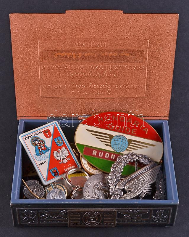 Beschreibung: Vegyes jelvény és kitűző tétel "Emlékül a szocialista haza fegyveres szolgálatáért a népközt. honvédelmi miniszterétől" fémdobozban T:vegyes