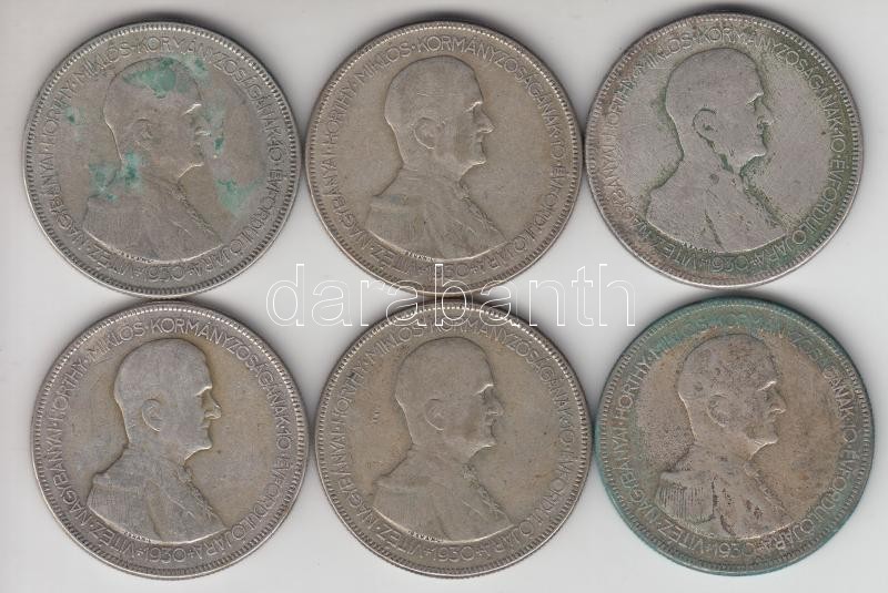 1930. 5P Ag "Horthy-jobbra" (6x) T:3 https://www.darabanth.com/de/187-Fernauktion/187.0/Numismatik/Ungarische-Munzen~8/1930-5P-Ag-Horthy-jobbra-6x-T3~II691430
