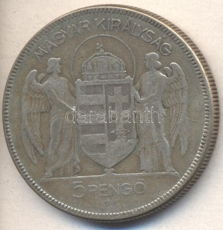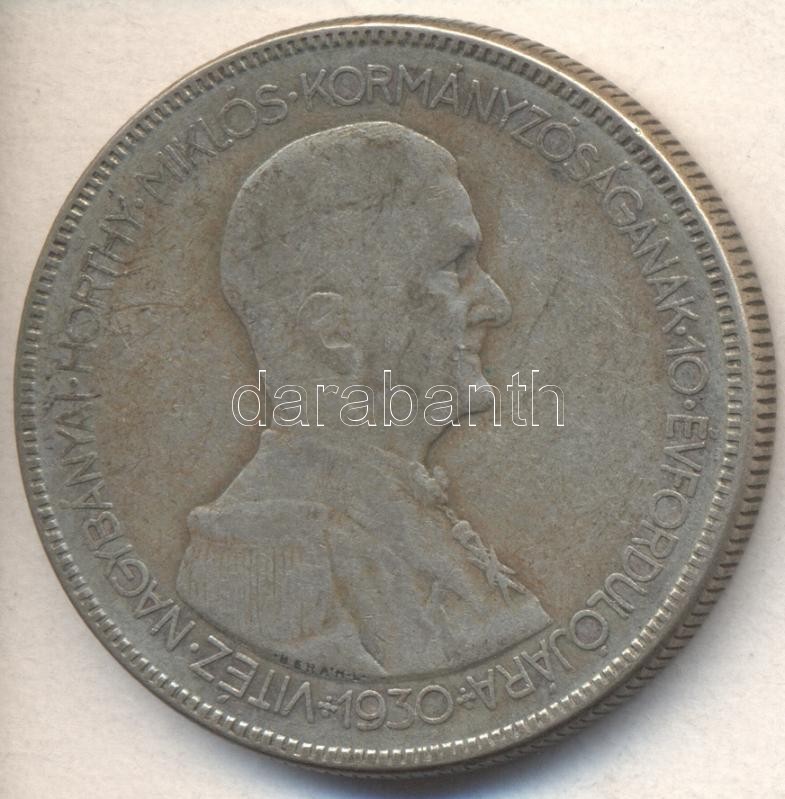 1930. 5P Ag "Horthy-jobbra" T:3 https://www.darabanth.com/de/187-Fernauktion/187.0/Numismatik/Ungarische-Munzen~8/1930-5P-Ag-Horthy-jobbra-T3~II690538