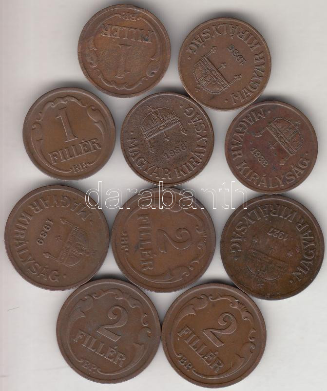 1931-1936. 1f + 1927-1939. 2f (10x) T:vegyes https://www.darabanth.com/de/187-Fernauktion/187.0/Numismatik/Ungarische-Munzen~8/1931-1936-1f-plus-1927-1939-2f-10x-Tvegyes~II687757