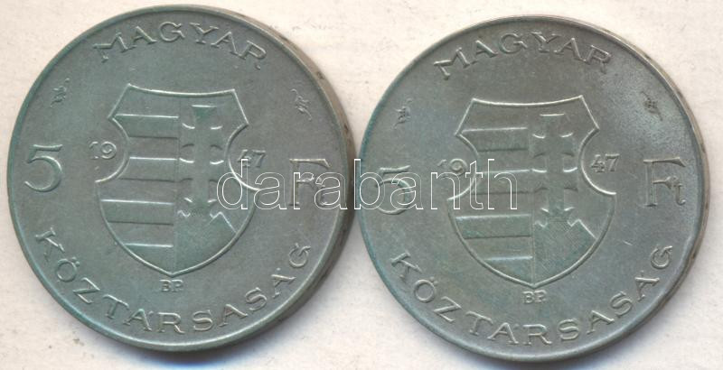 1947. 5Ft Ag "Kossuth" (2x) T:2- https://www.darabanth.com/de/187-Fernauktion/187.0/Numismatik/Ungarische-Munzen~8/1947-5Ft-Ag-Kossuth-2x-T2-~II692107