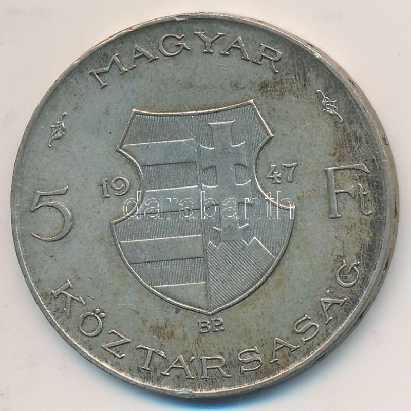 1947. 5Ft Ag "Kossuth" T:2- https://www.darabanth.com/de/187-Fernauktion/187.0/Numismatik/Ungarische-Munzen~8/1947-5Ft-Ag-Kossuth-T2-~II685579