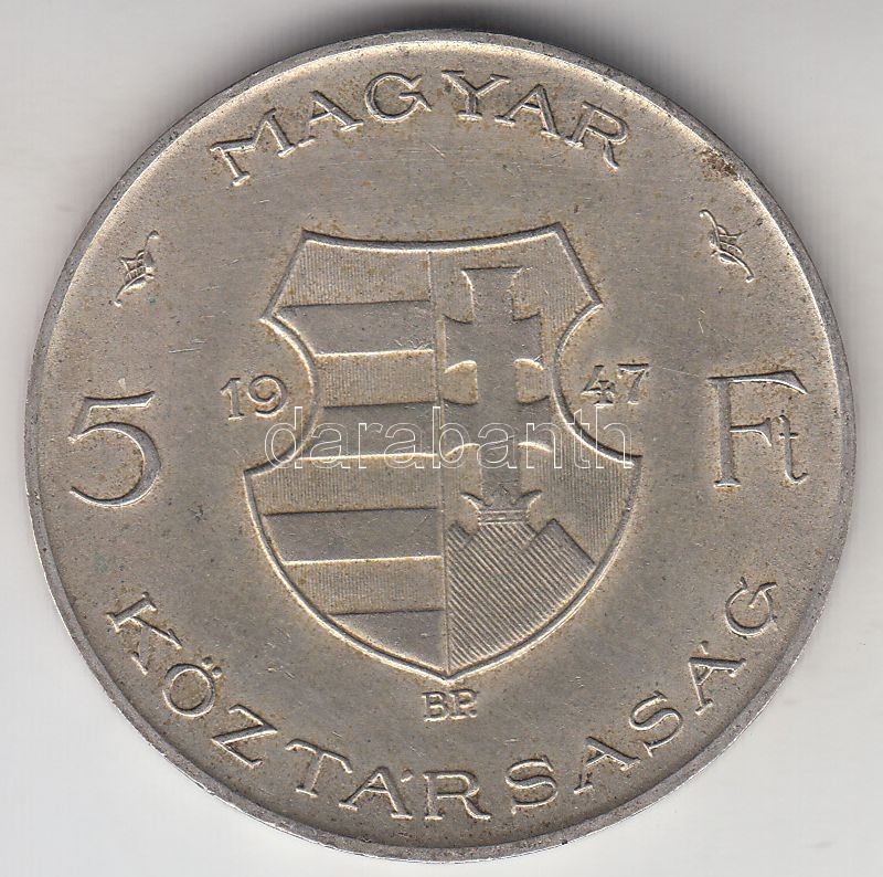 1947. 5Ft Ag "Kossuth" T:2 https://www.darabanth.com/de/187-Fernauktion/187.0/Numismatik/Ungarische-Munzen~8/1947-5Ft-Ag-Kossuth-T2~II691284