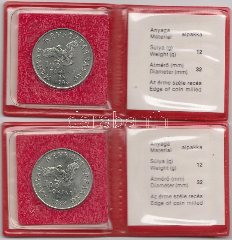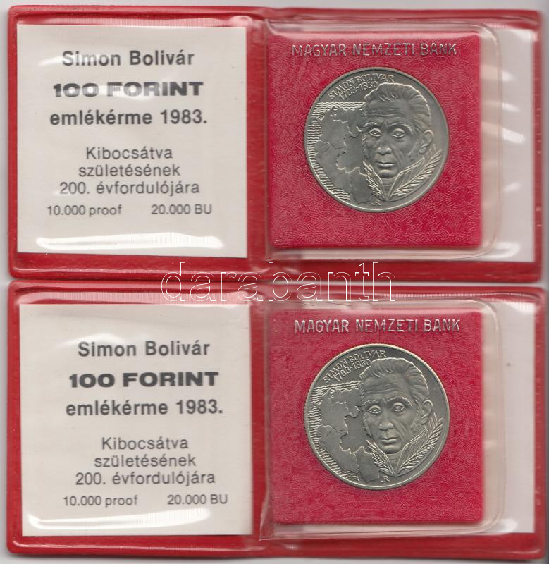 1983. 100Ft "Simon Bolivár" alpakka (2x) T:BU Eredeti tokban, tanúsítv... https://www.darabanth.com/de/187-Fernauktion/187.0/Numismatik/Ungarische-Munzen~8/1983-100Ft-Simon-Bolivar-alpakka-2x-TBU-Eredeti-tokban-tanusitvannyal~II693729