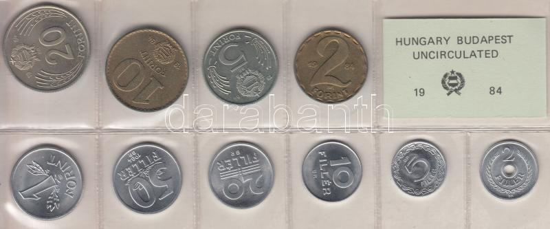 1984. 2f-20Ft 10db klf érmés forgalmi sor fóliatokban T:1 https://www.darabanth.com/de/187-Fernauktion/187.0/Numismatik/Ungarische-Munzen~8/1984-2f-20Ft-10db-klf-ermes-forgalmi-sor-foliatokban-T1~II689169