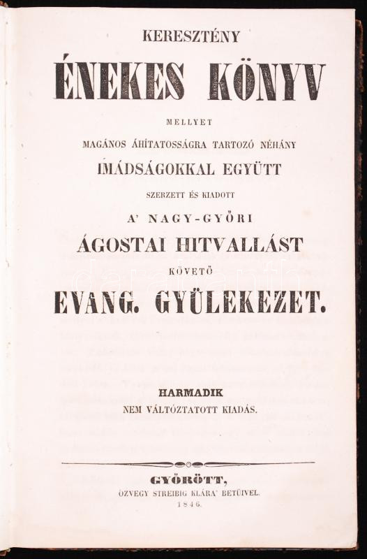 Keresztény énekes könyv mellyet magános áhítatosságra tartozó néhány imádságokkal együtt szerzett és kiadott a' nagy-győri ágostai hitvallást követő evang. gyülekezet. Harmadik nem váltóztatott kiadás. Győrött, 1846, özvegy Streibig Klára' betüivel. Korabeli, dombornyomott, aranyozott egészbőr kötésben (gerincén sérült)