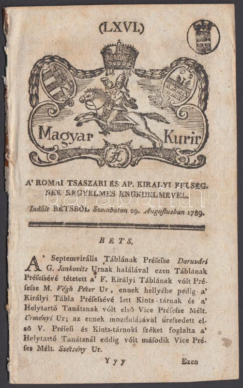 1789 Magyar Kurir. (Szerk. Szacsvay Sándor) LXVI. szám (aug. 29.), pp.... https://www.darabanth.com/de/188-Fernauktion/188.0/Andere-Sammelgebiete/Drucksachen~15000025/1789-Magyar-Kurir-Szerk-Szacsvay-Sandor-LXVI-szam-aug-29-pp-962-976~II699593