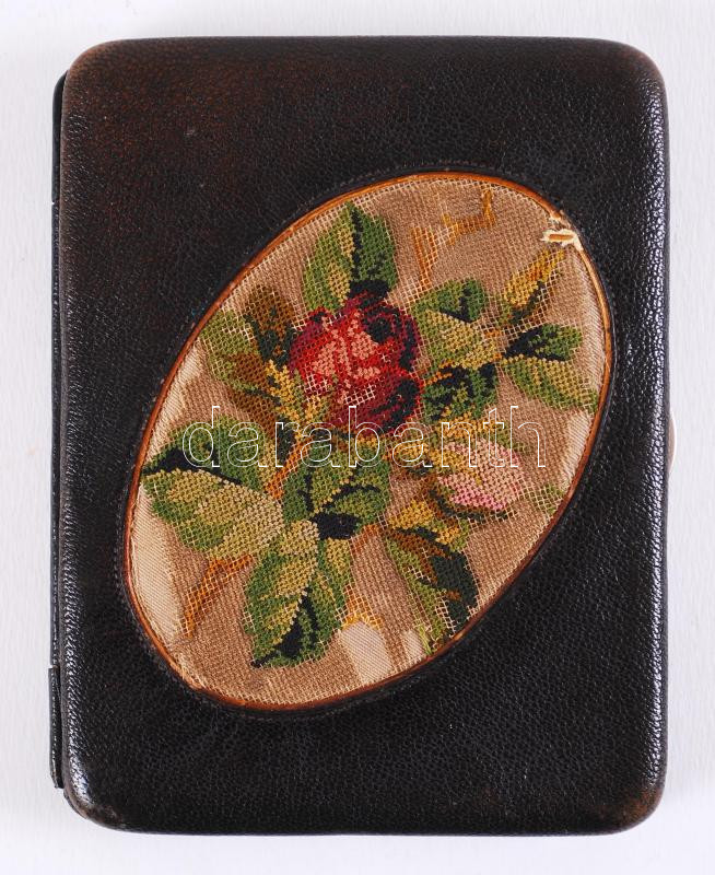 Hímzéssel díszített, régi, bőr irattárca (javításra szorul) /