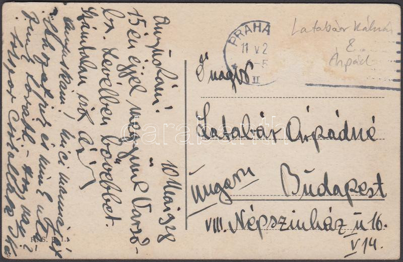 Beschreibung: 1928 Latabár Kálmán (1902-1970) és Árpád (1903-1961) édesanyjuknak írt képeslapja Prágából