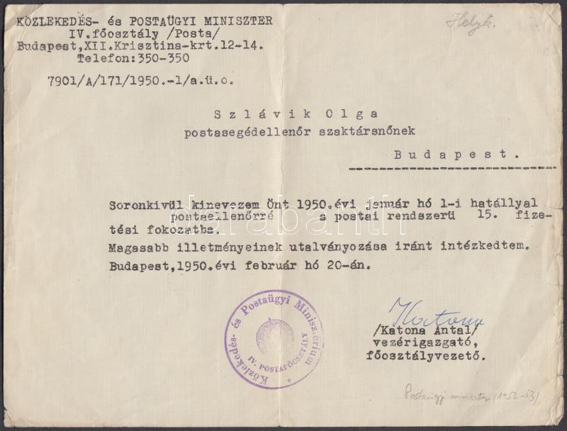 1950 Katona Antal postaügyi miniszter által aláírt kinevezés https://www.darabanth.com/de/188-Fernauktion/188.0/Andere-Sammelgebiete/Signatur~15000016/1950-Katona-Antal-postaugyi-miniszter-altal-alairt-kinevezes~II703285
