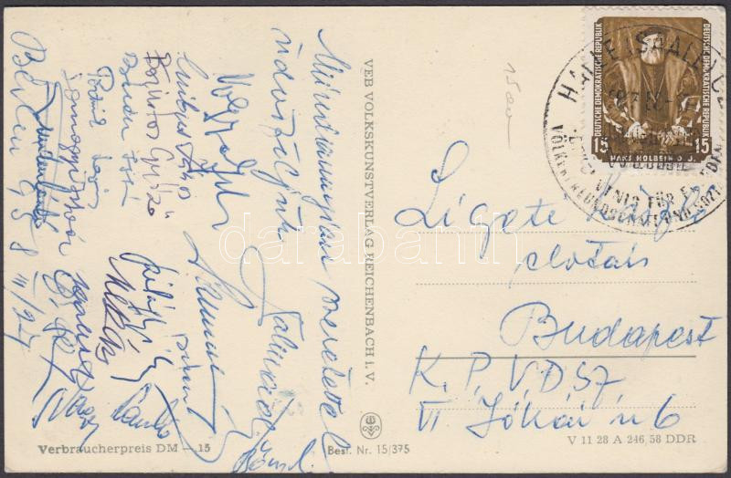 Beschreibung: 1958 Magyar sakkozók által aláírt képeslap: pl Forintos, Portisch, Szilágyi...
