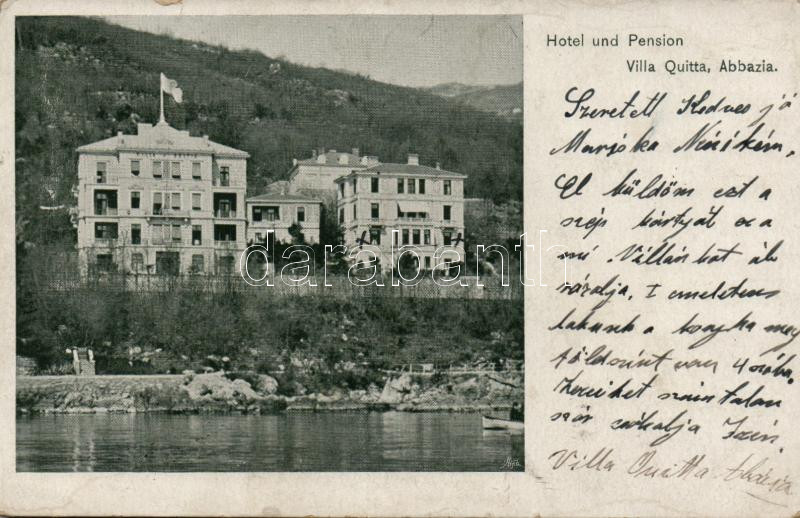 Abbazia Opatija, Hotel and Pension Villa Quitta (small tear) https://www.darabanth.com/de/188-Fernauktion/188.0/Ansichtskarten/Kroatien~4000009/Abbazia-Opatija-Hotel-and-Pension-Villa-Quitta-small-tear~II699021