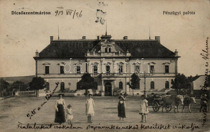 Dicsőszentmárton Financial Palace, ox cart (fl) https://www.darabanth.com/de/188-Fernauktion/188.0/Ansichtskarten/Siebenburgen~4000006/Dicsoszentmarton-Financial-Palace-ox-cart-fl~II696405
