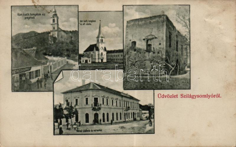Beschreibung: Szilágysomlyó church, rectory, school, hotel and town hall, shop of Károly Veres (fl)