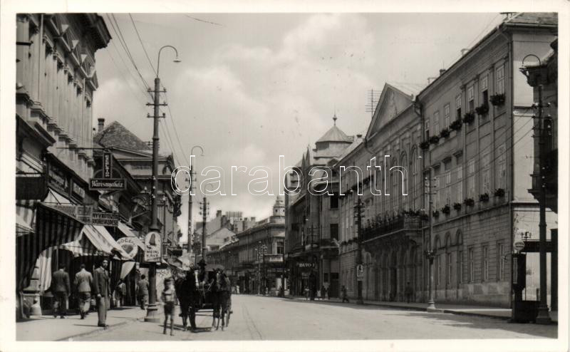 Beschreibung: Kaposvár Fő utca, Megyeháza, Harisnyaház, Könyvkötészet, Meinl kávé