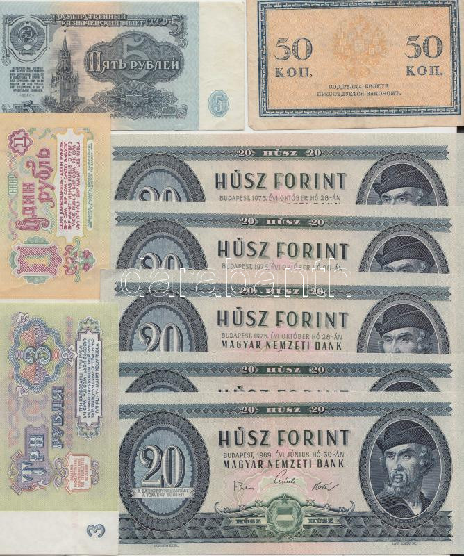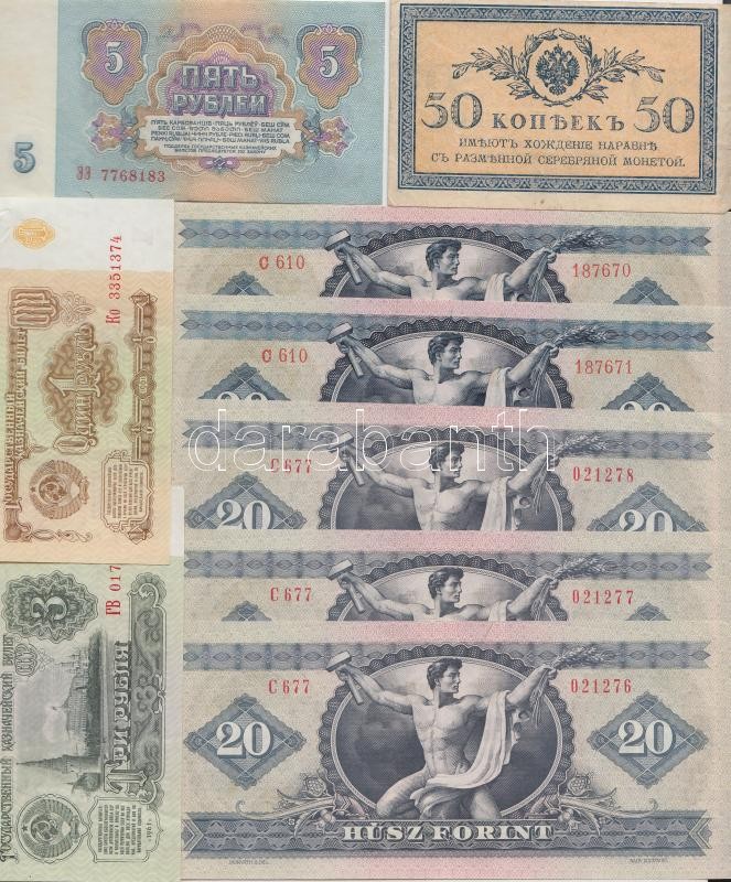 Beschreibung: 1969. 20Ft (2x) egymás utáni sorszámmal, nyomdai papírránccal T:I + 1975. 20Ft (3x) egymás utáni sorszámmal T:II + 4db klf orosz/szovjet bankjegy T:vegyes