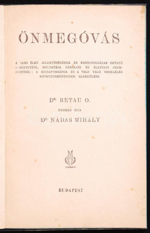Dr. Retau O. nyomán írta: Dr. Nádas Mihály: Önmegóvás. A nemi élet jelentőségének és fontosságának oktató ismertetése, méltatása erkölcsi és élettani szempontból; a kicsapongások és a vele való visszaélés következményeinek elkerülése. É.n., Budapest, k.n., félvászon kötésben