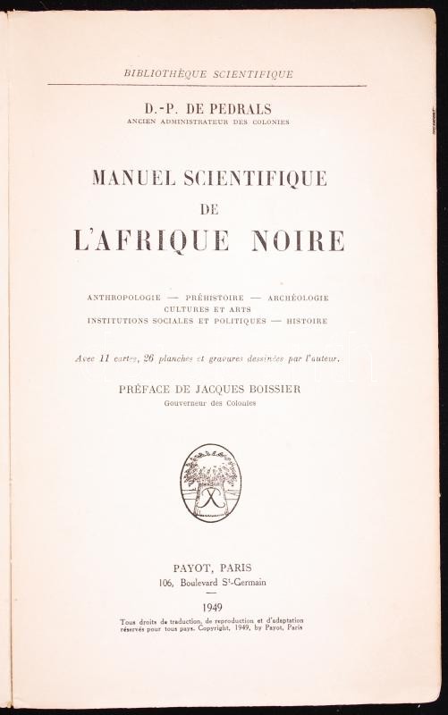 D.-P. de Pedrals: Manuel Scientifique de L'Afrique Noire. Cartes et gravures dessinées par l'auteur. Paris, 1949, Payot. Kiadói papírkötésben, illusztrált /