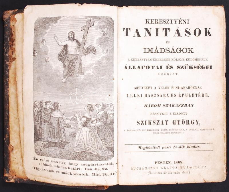 Beschreibung: Szikszay György: Keresztyéni tanitások és imádságok a keresztyén embernek külön-különféle állapotai és szükségei szerint. Pesten, 1868, Bucsánszky Alajos tulajdona. Kiadói, dombornyomott, félbőr kötésben, címképpel, a címlapon vignettával (borító félig levált)