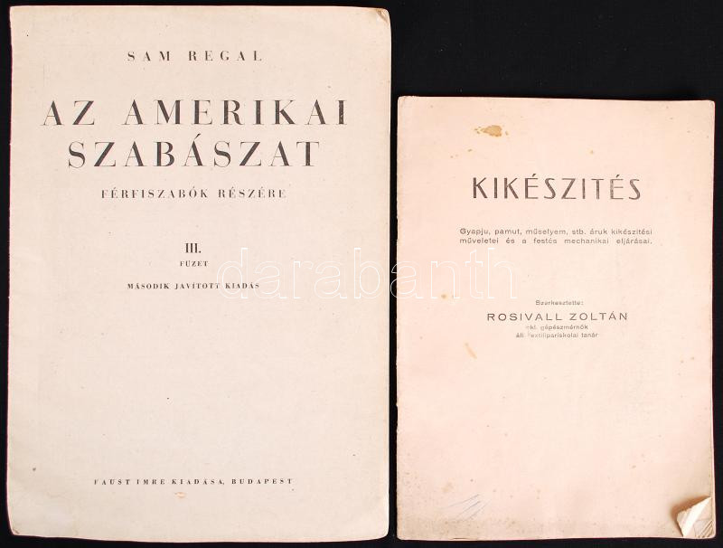 2db szabászati kiadvány: Kikészités. Gyapju, pamut, műselyem, stb. áruk kikészitési műveletei és a festés mechanikai eljárásai; Az amerikai szabászat. Férfiszabók részére