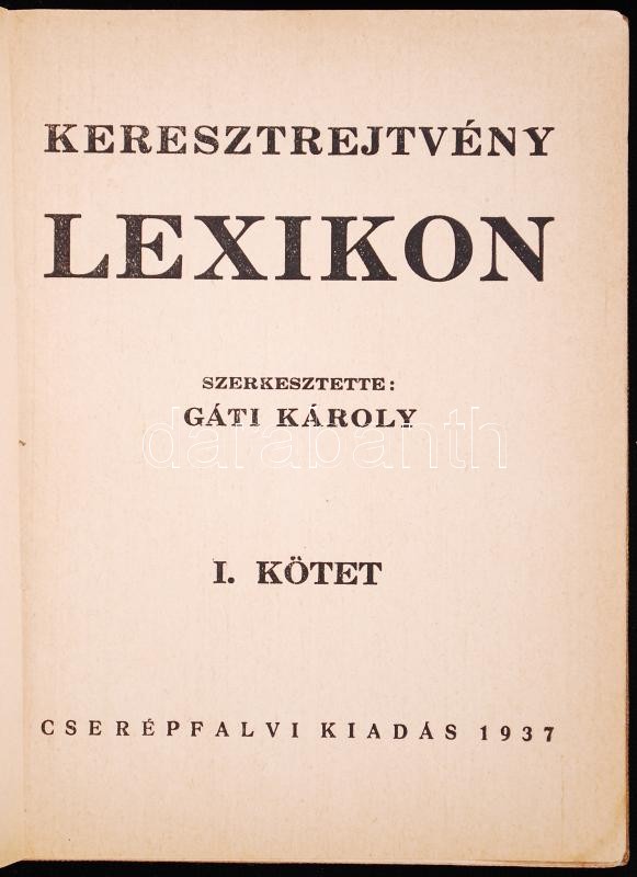 Gáti Károly: Keresztrejtvény-lexikon I. kötet. Budapest 1937. Cserépfa... https://www.darabanth.com/de/189-Fernauktion/189.0/Andere-Sammelgebiete/Bucher-Sonstige-Raritaten~4000039/Gati-Karoly-Keresztrejtveny-lexikon-I-kotet-Budapest-1937-Cserepfalvi-kiadas-Foldrajz-i~II705341