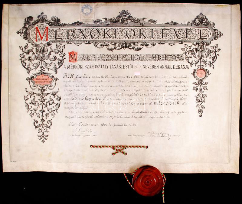 1896 Mérnöki pergamen oklevél szép viaszpecséttel a fa fedél nélkül / ... https://www.darabanth.com/de/189-Fernauktion/189.0/Andere-Sammelgebiete/Dokument~4000014/1896-Mernoki-pergamen-oklevel-szep-viaszpecsettel-a-fa-fedel-nelkul--3Cbr3E1896-Ingeniur-pe~II709696