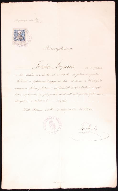 1910 Pápai néptanítói bizonyítvány a M. Kir. Földmives Iskolából fiume... https://www.darabanth.com/de/189-Fernauktion/189.0/Andere-Sammelgebiete/Dokument~4000014/1910-Papai-neptanitoi-bizonyitvany-a-M-Kir-Foldmives-Iskolabol-fiumei-meritett-papiron~II673902