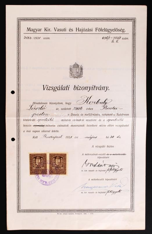 1931 Sportcélú motoroscsónak-vezetői bizonyítvány a M. Kir. Vasuti és ... https://www.darabanth.com/de/189-Fernauktion/189.0/Andere-Sammelgebiete/Dokument~4000014/1931-Sportcelu-motoroscsonak-vezetoi-bizonyitvany-a-M-Kir-Vasuti-es-Hajozasi-Felugyelos~II709500
