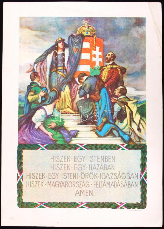 1927 Magyar hiszekegy, irredenta nyomat. Hátoldalán Budapest székesfőváros polgármestere, a belügyminisztérium és a Magyar Hiszekegyet Terjesztő Országos Bizottság elnökének pecsétjével, 35x25cm