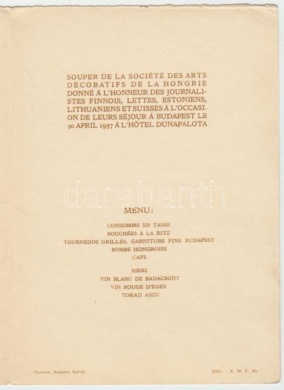 1937 A magyar Szépművészeti Társaság díszvacsorájának címeres menükárt... https://www.darabanth.com/de/189-Fernauktion/189.0/Andere-Sammelgebiete/Drucksachen~4000025/1937-A-magyar-Szepmuveszeti-Tarsasag-diszvacsorajanak-cimeres-menukartyaja~II657198
