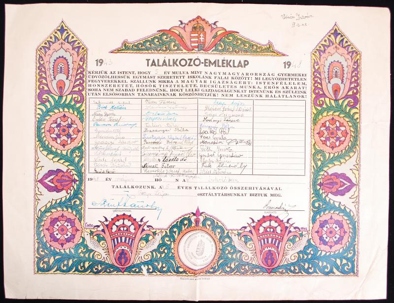 Beschreibung: 1943 Találkozó-emléklap irredenta szöveggel, a Kispest-Munkástelepi M. Kir. Állami Polgári Fiuiskolából, 31x41cm