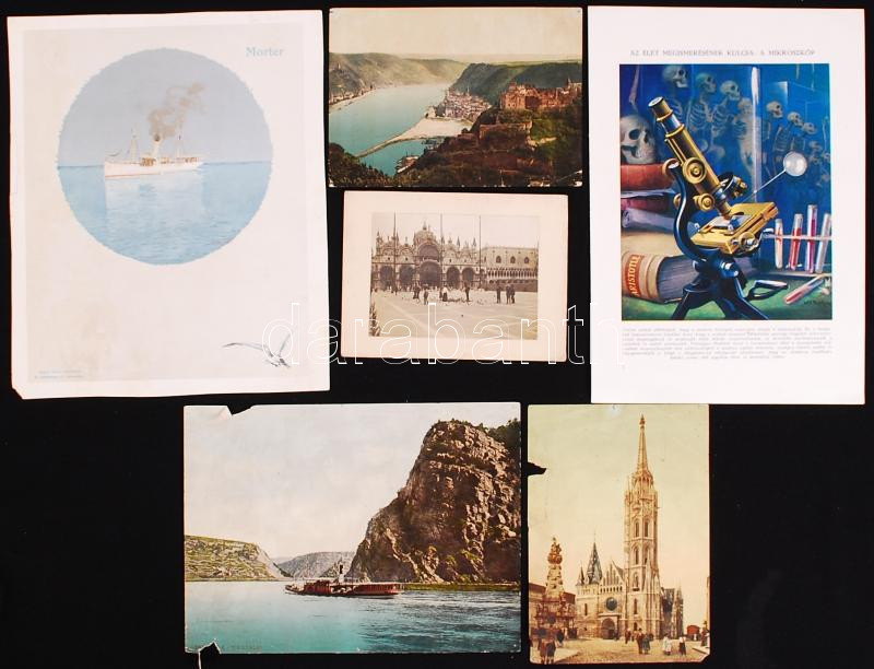 Beschreibung: Cca 1930 6 db fotó és nyomtatvány, kisebb szakadásokkal, 10×15-24×18 cm