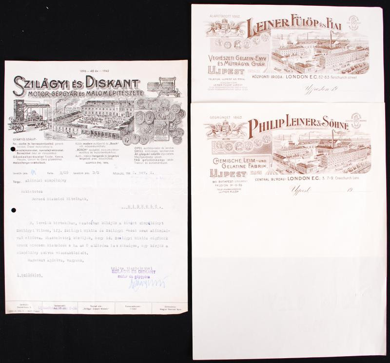Beschreibung: cca 1940 3 db Fejléces levélpapír, 2 kitöltetlen (Szilágyi és Diskant, Leiner Fülöp és fiai)