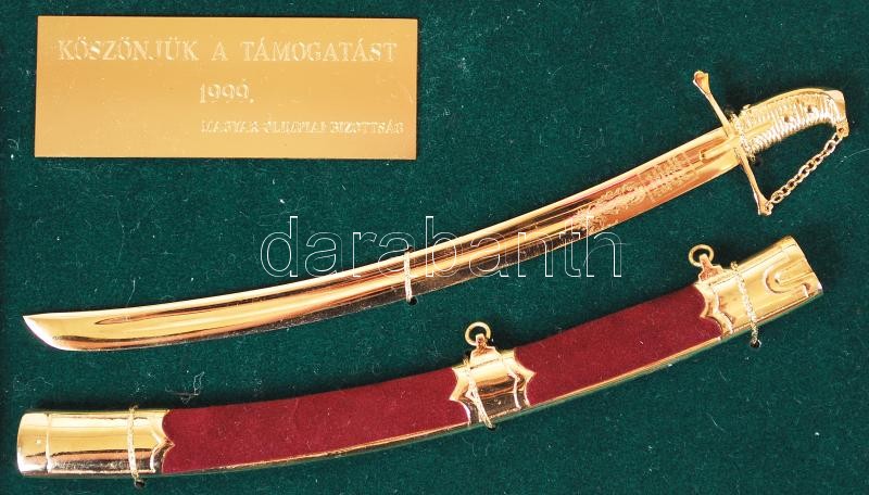 Beschreibung: 1999 Magyar Olimpiai Bizottság támogatói díja. Díszszablya fémből, és bársonyból, XVIII. sz-i minta alapján. Eredeti díszdobozban.