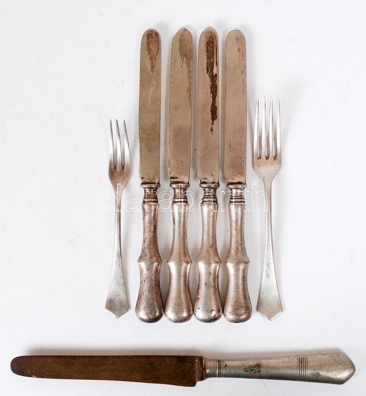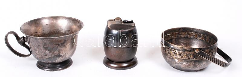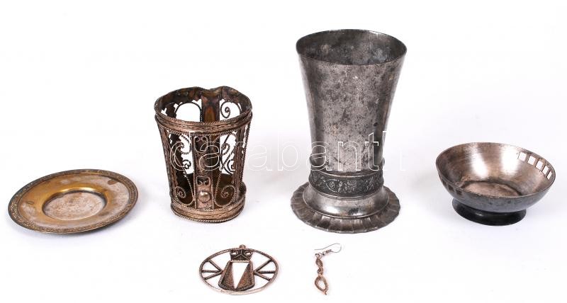 Vegyes tétel, szép, túlnyomórészt ezüstözött, jelzett, alpakka és fém dísztárgyak. Pl.: Berndorfi ezüstözött alpakka "csuklós" fülű csésze; füles kínálótálka; díszes áttört pohár; Ón pohár, jelzett; öngyújtó + tok; Argentor ezüstözött tálka és poháralátét; 4 db ezüst nyelű, jelzett kés, 2db alpakka villa és egy ezüstözött nyelű kés; egy nagyméretű medál; fél pár fülbevaló