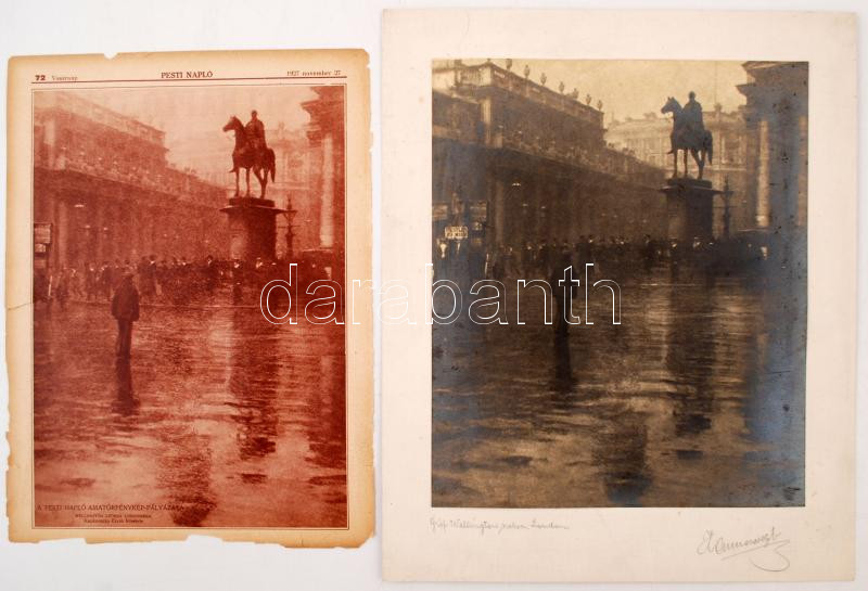 Beschreibung: 1920 Kankowszky Ervin (1884-1945): Gróf Wellington szobra Londonban, aláírt vintage fotóművészeti alkotás festészet utánzó stílusban, hozzáadva egy 1927-es publikálás újságkivágatát, 26x22 cm, karton 34x28 cm