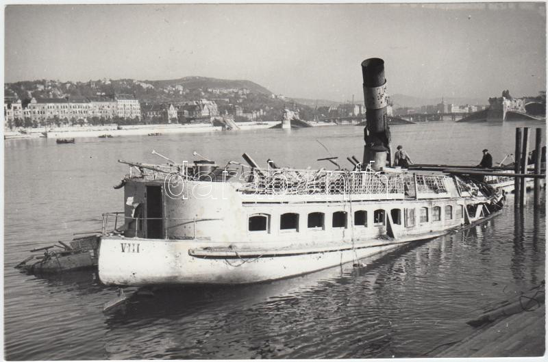 1946 Dr. Csörgeő Tibor (1869-1968) fotója a háború utáni Budapestről: az előtérben egy félig elsüllyesztett hajó, a háttérben a lebombázott Lánchíd és a romos budai rakpart, a Lánchíd mögött a már átadott Kossuth-híd látható /