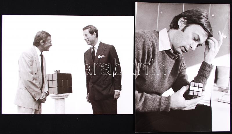 Beschreibung: 1981 2 db fotó Rubik Ernő (1944) a Rubik kocka feltalálójáról és Károly, a walesi hercegről a bűvös kockával. 18x24 cm