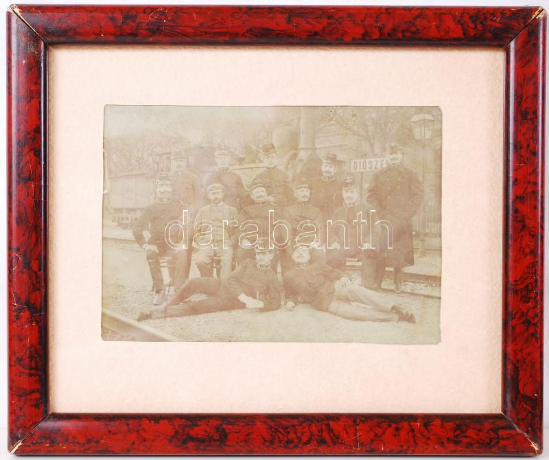 Beschreibung: cca 1900 Diószeg vasútállomás a vasutasokkal fotó üvegezett keretben