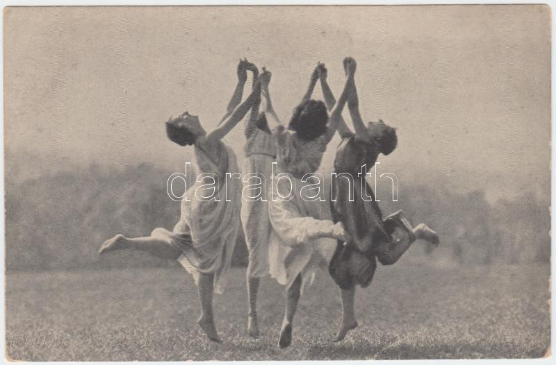 Beschreibung: cca 1930 Szentpál Olga iskolájának tagjai- szabadtéri mozgásművészeti kompozíció, fotóképeslap, 9×13 cm