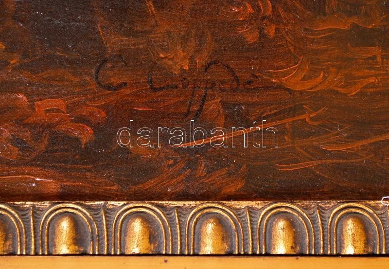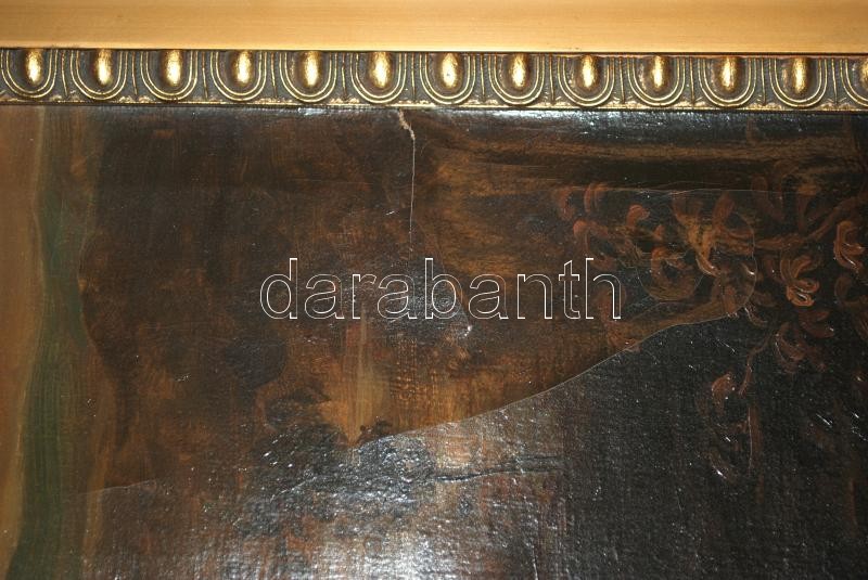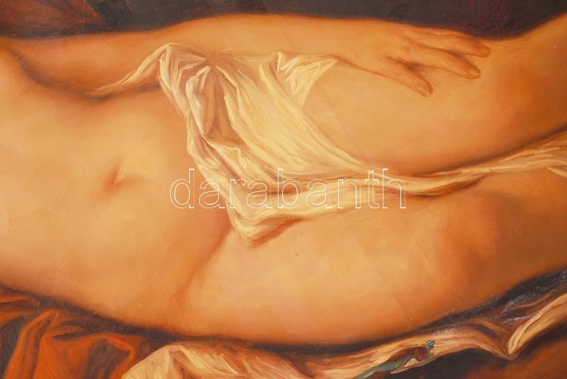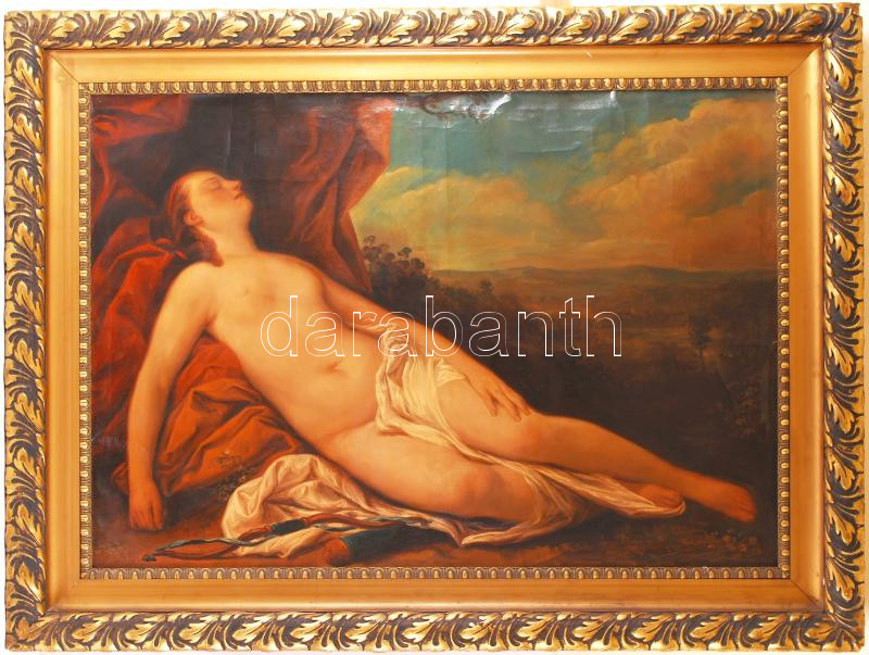 Beschreibung: Coppedé Carlo (1868-1952): Alvó Vénusz. Olaj, vászon, jelzett, sérült, antik jó keretben, 70×100 cm