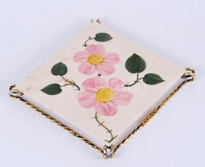 Beschreibung: Virágokkal díszített, kézzel festett, jelzett edényalátét fém keretben /