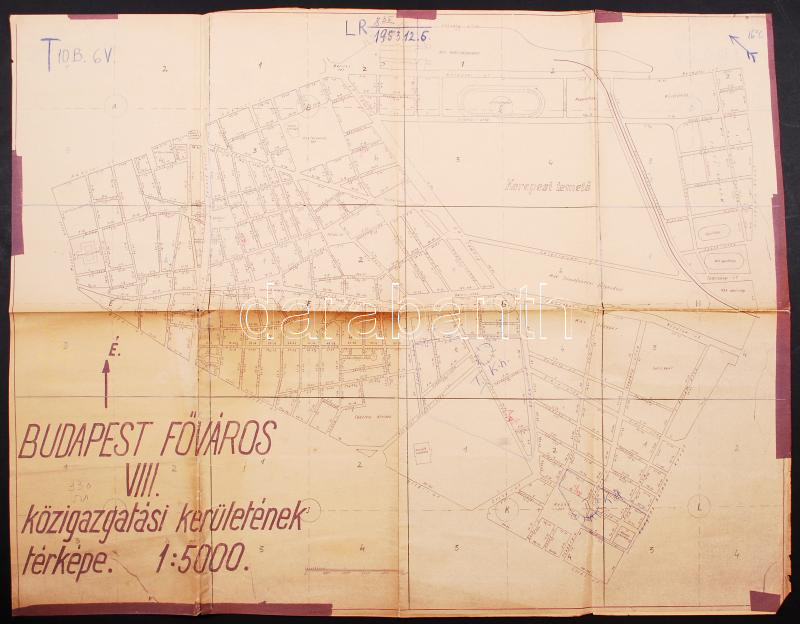 Beschreibung: Budapest főváros VIII. közigazgatási kerületének térképe (1:5000) kissé szakadt állapotban, kék ceruzával belerajzolva