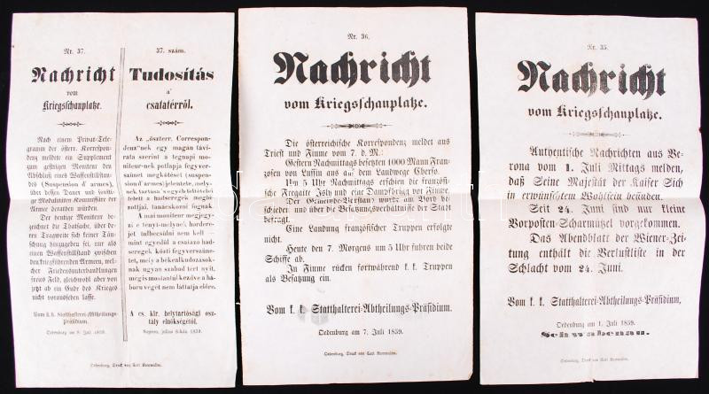 1859 Az osztrák-porosz háború alakulásáról kiadott 3 db hirdetmény, "Tudósítás a csatatérről", soproni kiadás, az egyik magyar nyelven is /